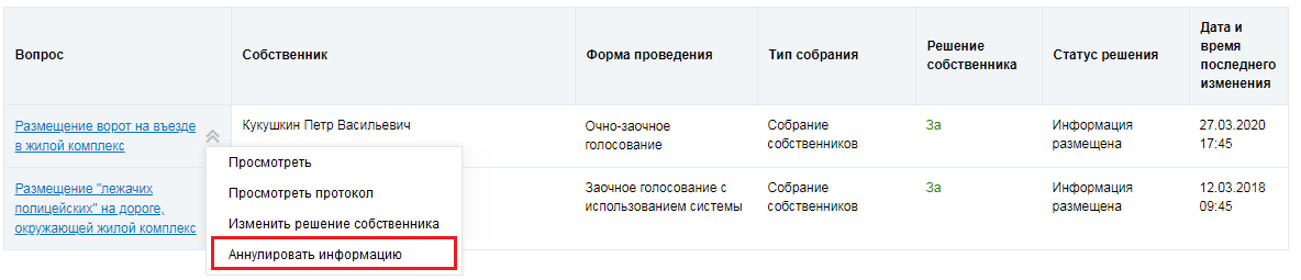 Гражданин с подтверждённым полномочием «Администратор общего собрания собственников» может аннулировать внесенное решение, если форма проведения собрания отличается от «Заочное голосование с использованием системы».