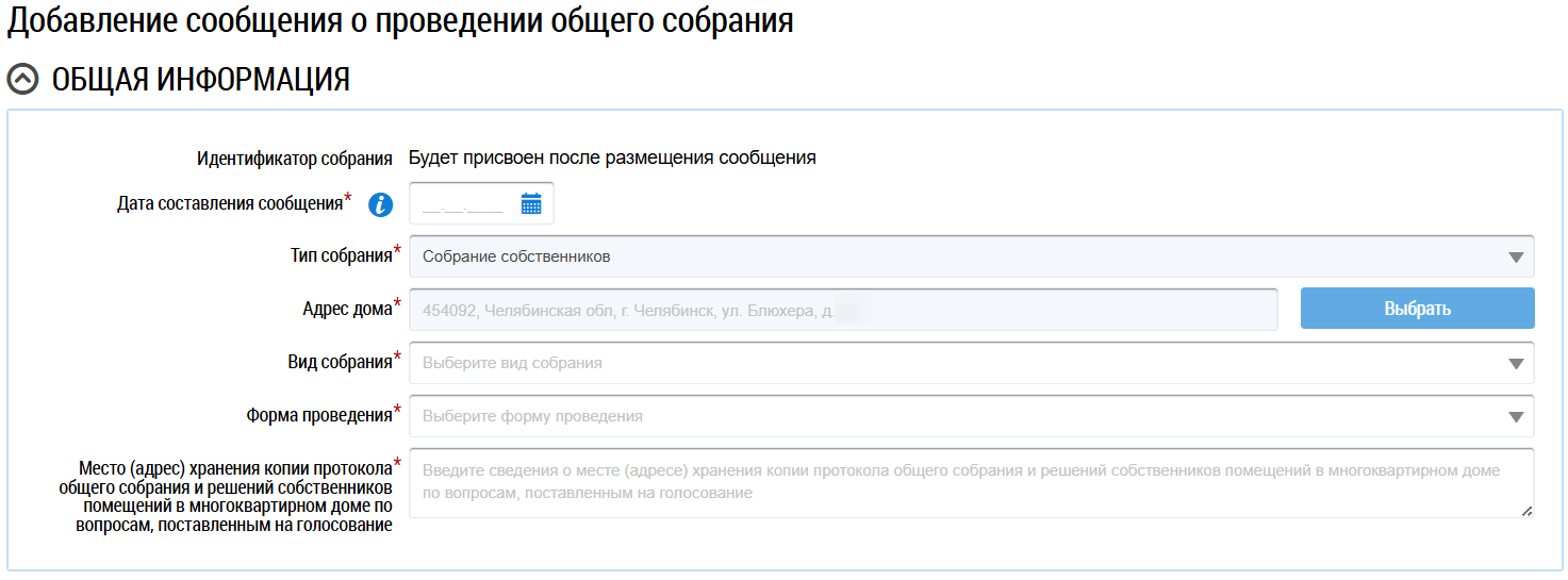 Заполните обязательные поля блока Общая информация. Для заполнения поля Дата составления сообщения выберите дату из календаря или введите ее вручную. В случае, если собственность или дом находится под управлением ТСЖ, ЖК, ЖСК или иного потребительского кооператива, для редактирования доступно поле Тип собрания. Выберите значение из выпадающего списка. При выборе типа собрания Собрание собственников для заполнения поля Адрес дома нажмите на кнопку Выбрать и выберите значение из справочника. При выборе типа собрания Собрание членов ТСЖ (в случае ТСЖ) или Собрание членов кооператива (в случае ЖК) отображаются дополнительные поля. В поле выбора ТСЖ необходимо выбрать ТСЖ/ЖК, в рамках которого будет проводиться собрание. В поле выбора адреса Система проставляет адреса всех МКД, управление которыми осуществляет выбранный кооператив или ТСЖ. Для выбора адреса дома нажмите на кнопку Выбрать и выберите значение из справочника. Из выпадающих списков выберите вид и форму собрания.
