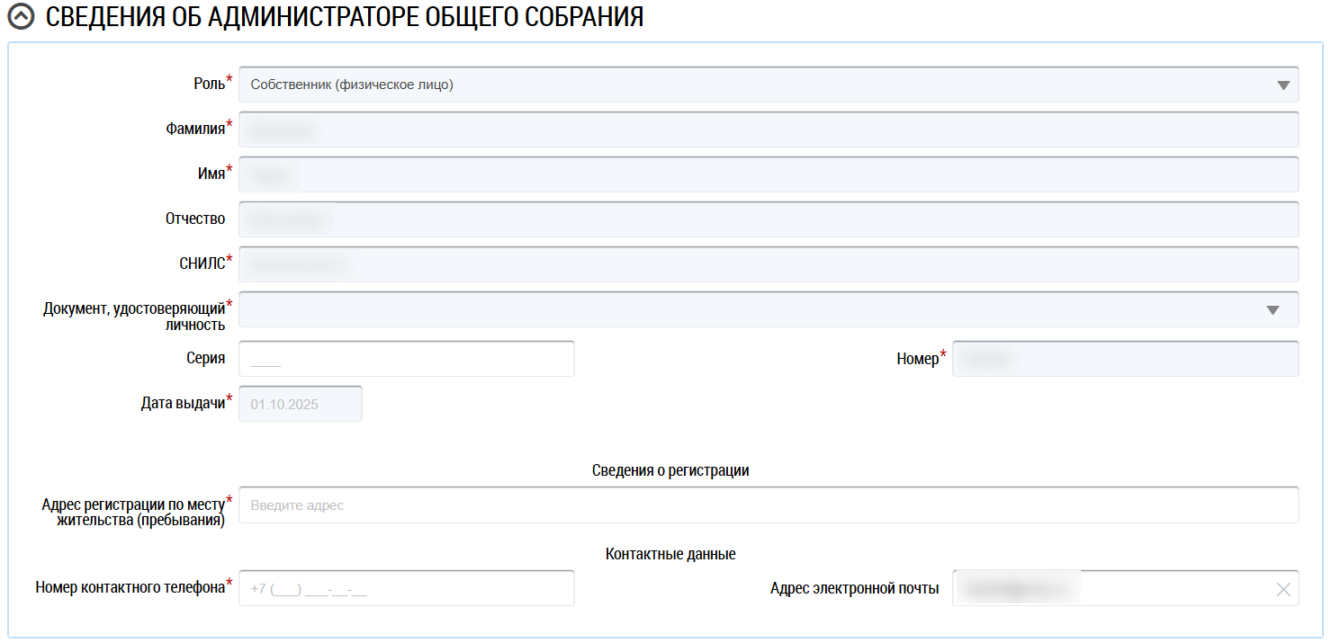 Блок Сведения об администраторе общего собрания отображается в случае, если в выпадающем поле Форма проведения выбрано значение Заочное голосование с использованием системы. Информация об администраторе ОСС заполняется автоматически в зависимости от вашей роли в Системе. Заполните другие обязательные поля, отмеченные звездочкой, необходимыми данными.