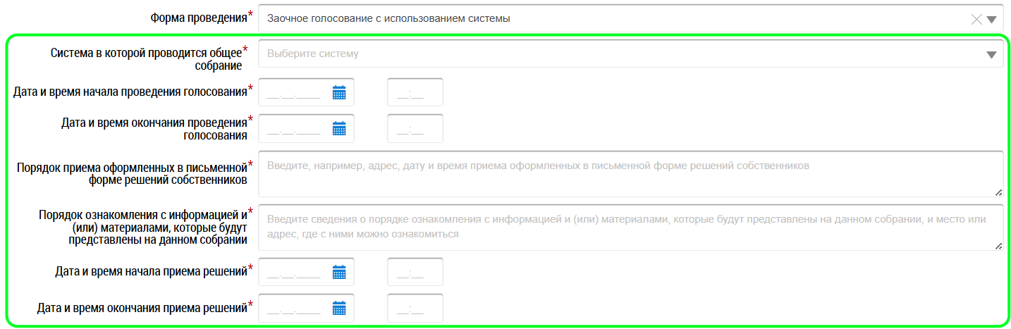 При выборе формы собрания «Заочное голосование с использованием системы» отображаются дополнительные поля.