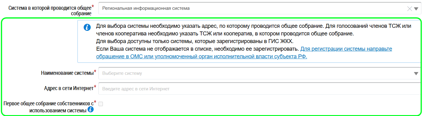 При выборе значения Региональная информационная система также отображается поле Первое общее собрание собственников с использованием системы. При необходимости установите флажок в этом поле.