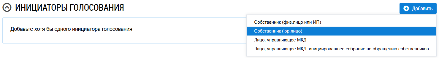 Для заполнения блока Инициаторы голосования нажмите на кнопку Добавить и выберите значение из выпадающего списка.