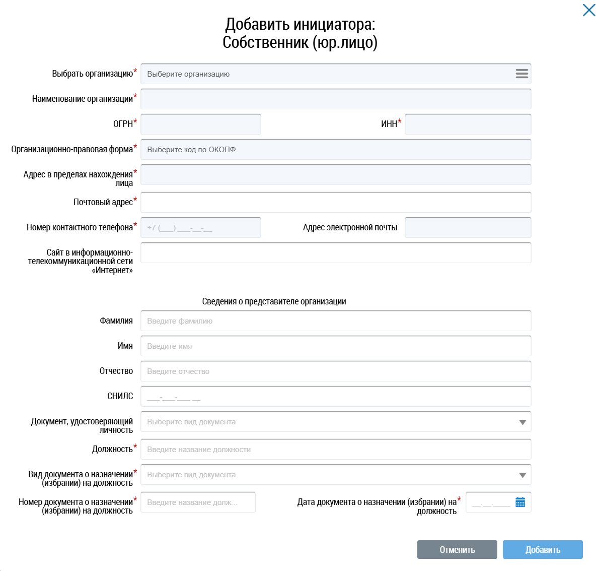 При выборе одного из пунктов в списке отображается модальное окно Добавить инициатора, в котором необходимо заполнить обязательные поля, выделенные звездочкой, и нажать кнопку Добавить.