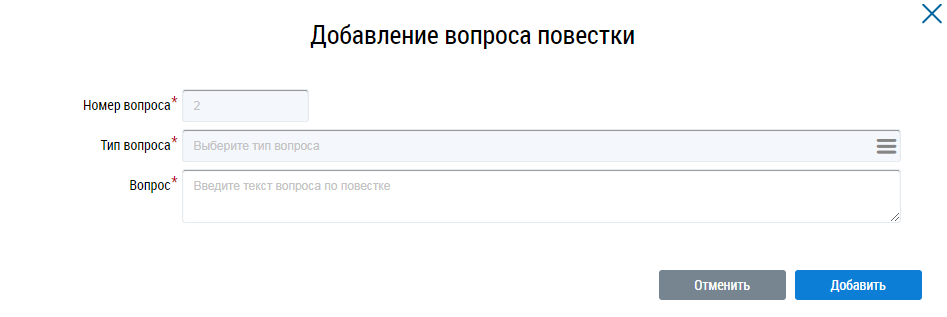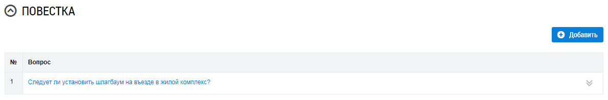 В блоке Повестка добавьте один или несколько вопросов повестки. Для добавления вопроса нажмите на кнопку Добавить.