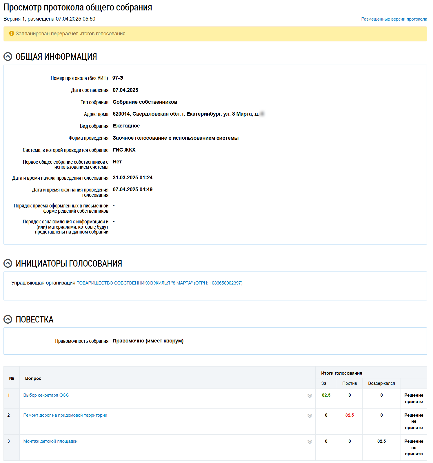Отображается страница просмотра протокола с общей информацией по нему и блоком с результатами голосования по вопросам повестки.