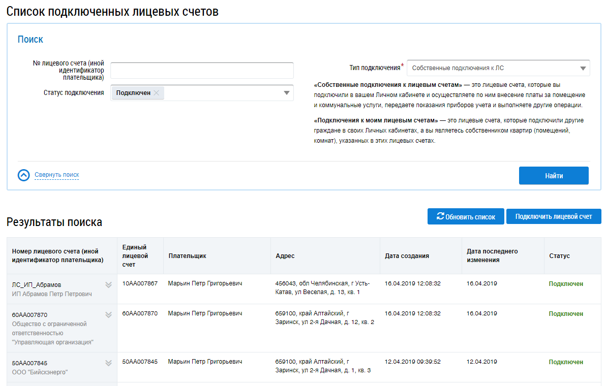Чтобы обновить список подключенных лицевых счетов, нажмите на кнопку Обновить список.