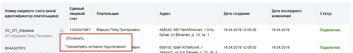 Просмотр подключенных лицевых счетов плательщика