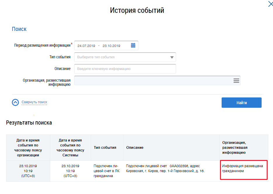 В истории событий по лицевому счету отображается история подключения/отключения по лицевому счету. В столбце Организация, разместившая информацию значение Информация размещена гражданином отображается если лицевой счет подключен автоматически к Вашему личному кабинету (отметка Информация размещена гражданином отображается, так как автоматическое подключение было произведено на основании данных Вашей учетной записи), либо если лицевой счет подключен вручную к Вашему личному кабинету (отметка Информация размещена гражданином отображается, так как подключение было произведено непосредственно гражданином, то есть Вами).
