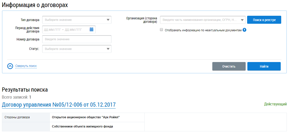 Отображается страница Информация о договорах, содержащая блок поиска и блок результатов поиска.