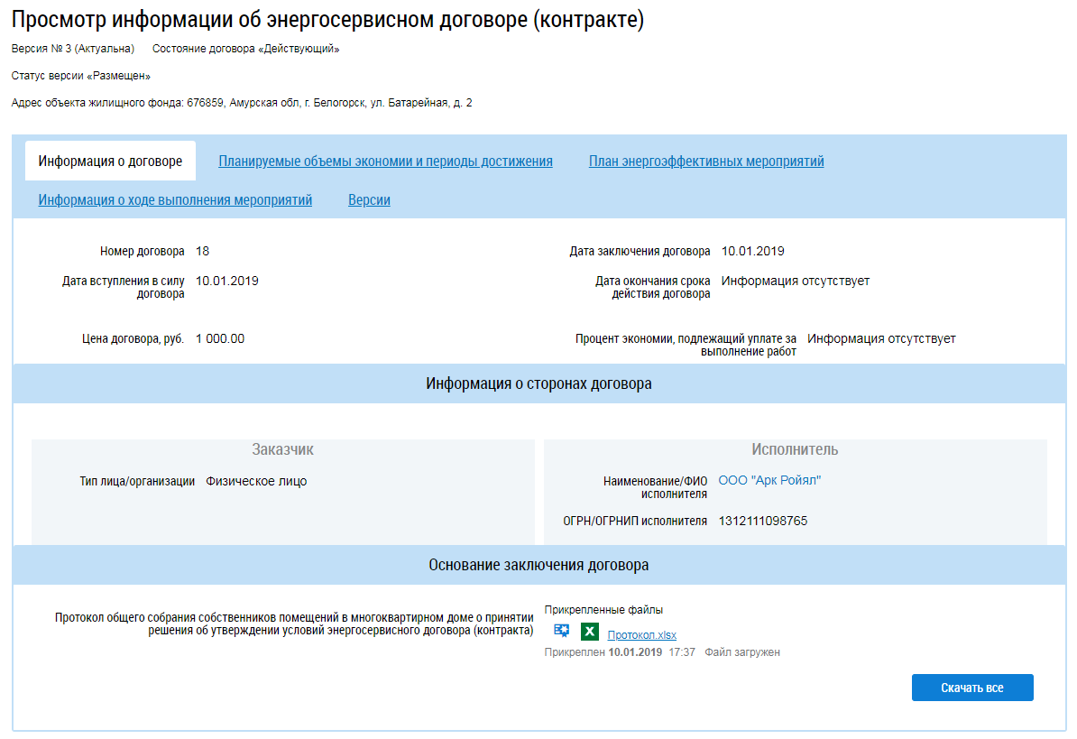 При выборе энергосервисного договора (контракта) отображается страница Просмотр информации об энергосервисном договоре (контракте) на вкладке Информация о договоре. Вкладка содержит общие сведения о договоре (дата заключения, дата вступления в силу и т.п.) и сведения о сторонах договора. В блоке Основание заключения договора находятся прикрепленные файлы с текстом протокола ОСС. Для скачивания файла нажмите на гиперссылку с названием файла. Для скачивания всех прикрепленных файлов (если их несколько) нажмите на кнопку Скачать все.