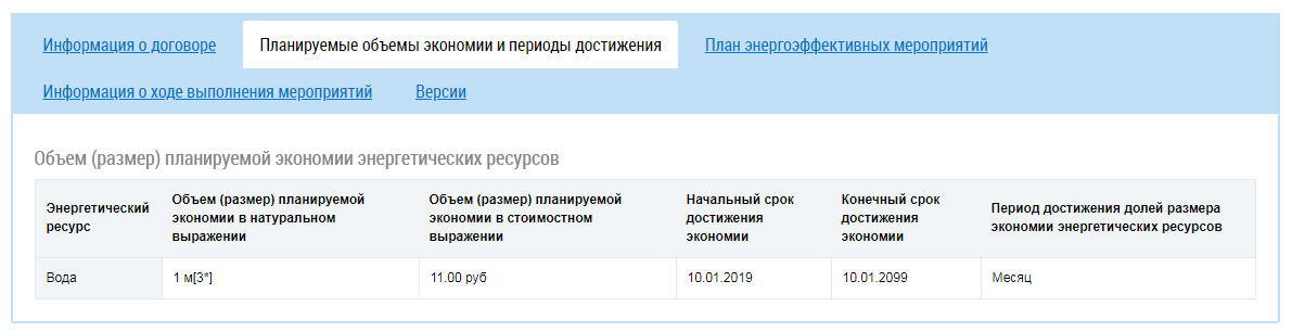 Вкладка Планируемые объемы экономии и периоды достижения содержит информацию об объеме (размере) планируемой экономии энергетических ресурсов в табличном виде.