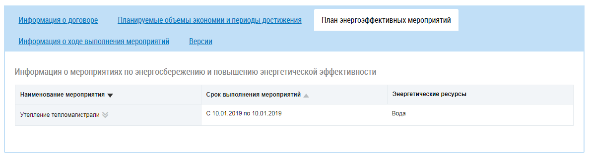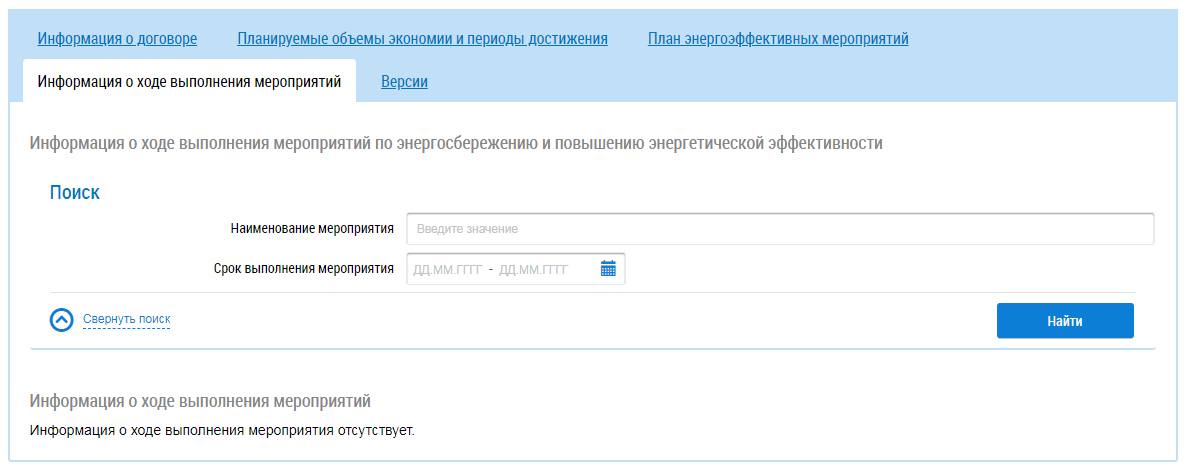 Вкладка Информация о ходе выполнения мероприятий содержит информацию о ходе выполнения мероприятий по энергосбережению и повышению энергетической эффективности.