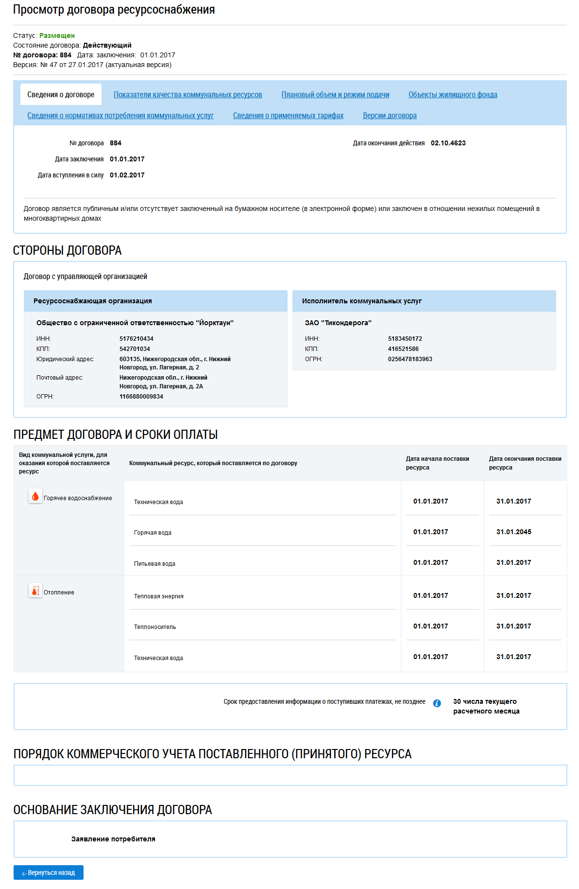 При выборе договора ресурсоснабжения отображается страница Просмотр договора ресурсоснабжения на вкладке Сведения о договоре. Вкладка содержит общую информацию о договоре (номер договора, дата заключения и т.п.), сведения о сторонах договора, предмете договора и сроках оплаты, порядке коммерческого учета ресурса и основании заключения договора.