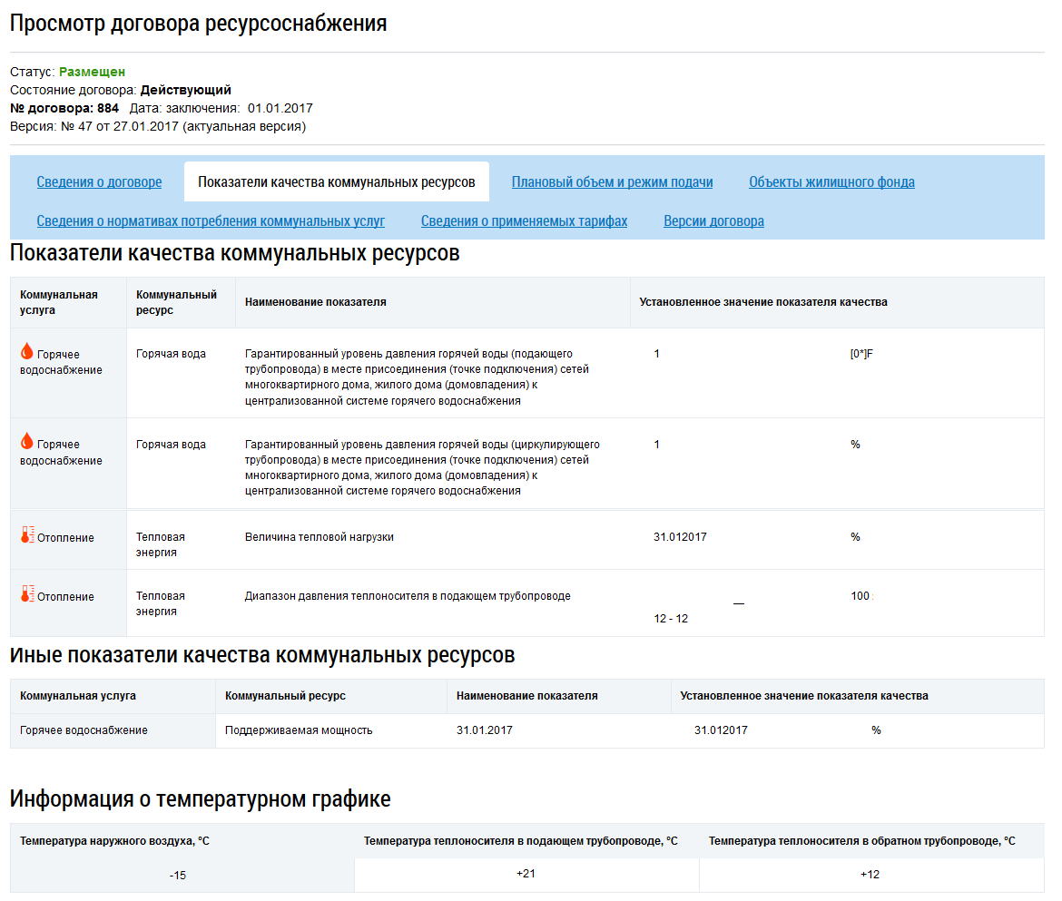 Вкладка Показатели качества коммунальных ресурсов содержит развернутые сведения о показателях качества.