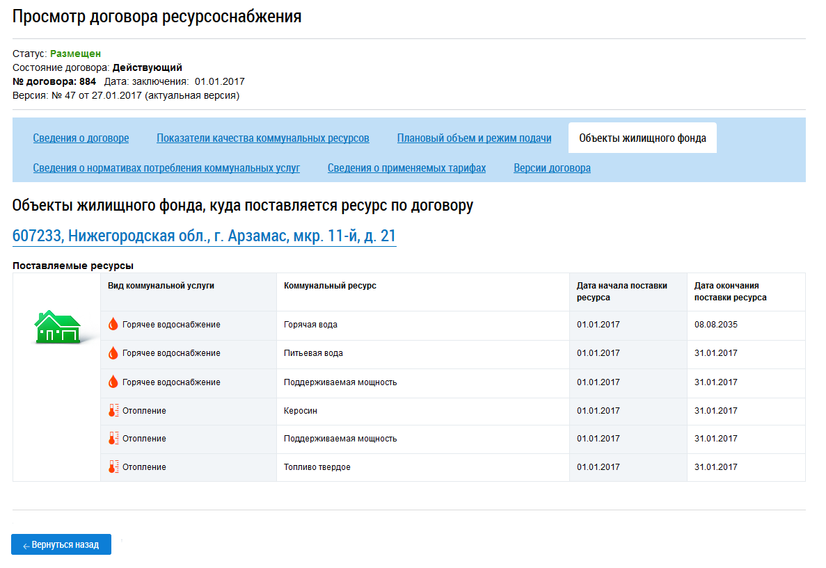 На вкладке Объекты жилищного фонда отображается дом, из помещения которого инициирован просмотр (см. п. Информация о договорах по дому). Для дома отображается список предоставляемых коммунальных ресурсов.