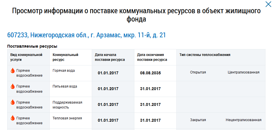 Для просмотра сведений о доме нажмите на гиперссылку с адресом дома. Отображается окно Просмотр информации о поставке коммунальных ресурсов в объект жилищного фонда.