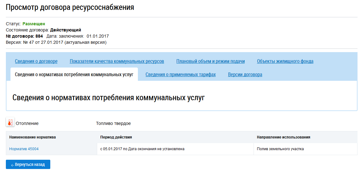 На вкладке Сведения о нормативах потребления коммунальных услуг отображается информация о нормативах.