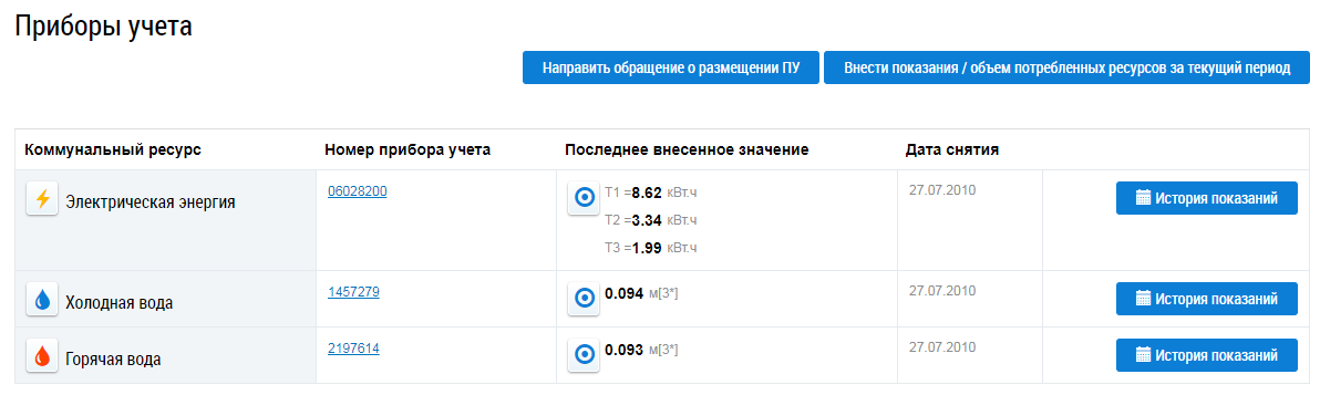 Просмотр списка приборов учета
