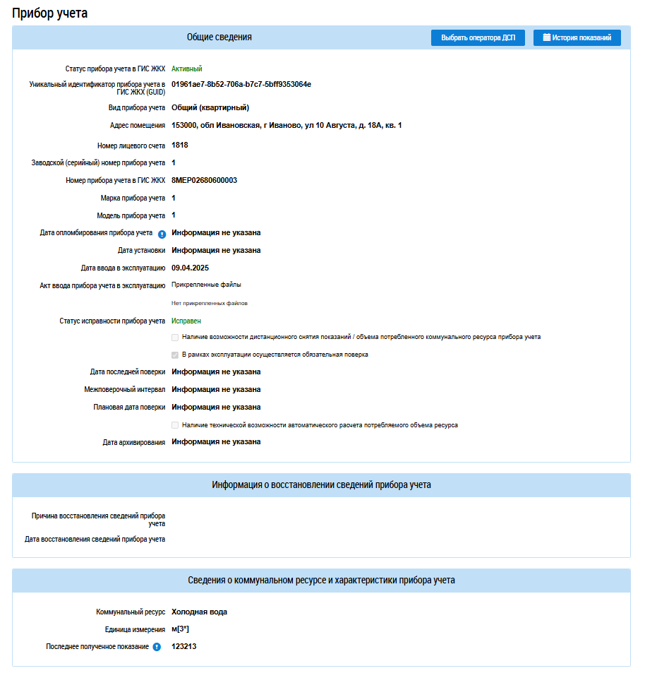 Для просмотра подробной информации по прибору учета нажмите на гиперссылку с номером ПУ. Отображается страница со сведениями о приборе учета.