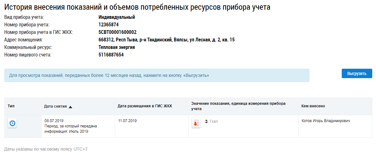 На данной странице доступна история показаний за последний год. Для просмотра более старых показаний нажмите на кнопку Выгрузить (Страница «История внесения показаний и объемов потребленных ресурсов прибора учета»). Отображается окно Выгрузка истории показаний приборов учета.