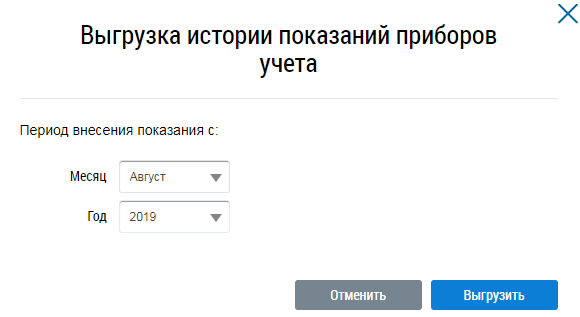 Укажите, с какого месяца и года нужно выгружать показания. Результаты выгрузки будут доступны через некоторое время. Информация о них придет в отдельном информационном сообщении.