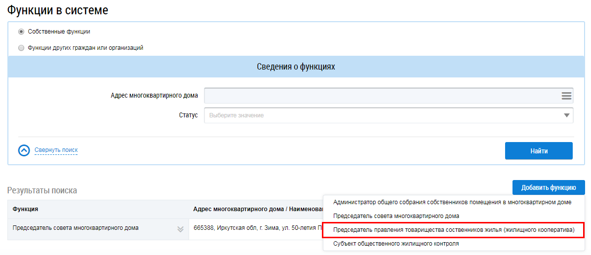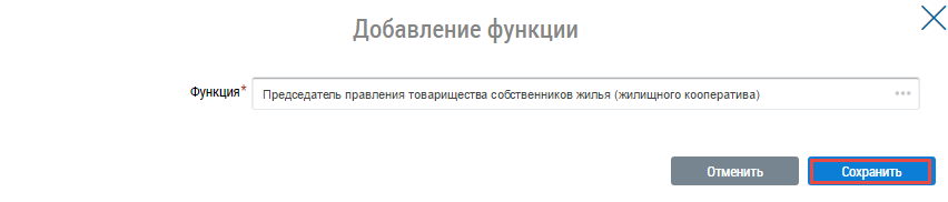 Для добавления функции председателя правления товарищества собственников жилья (жилищного кооператива) нажмите на кнопку Добавить функцию и выберите пункт выпадающего меню Председатель правления товарищества собственников жилья (жилищного кооператива).