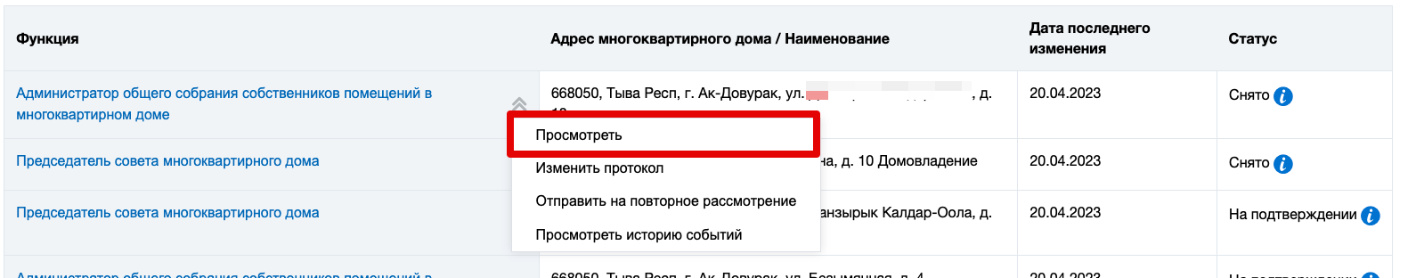 Чтобы просмотреть заявку, перейдите на страницу Функции в системе и в контекстном меню интересующей вас функции выберите пункт Просмотреть.