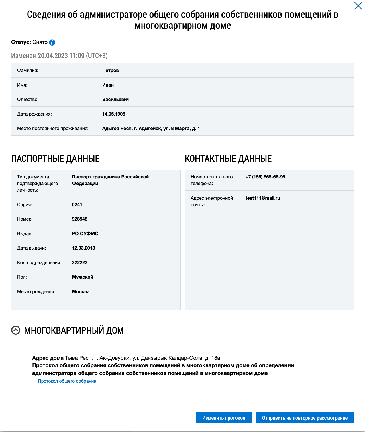 - Изменить протокол — доступно для заявок в статусе Снято;
