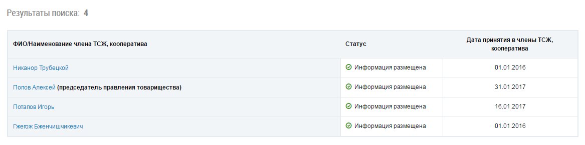 В списке результатов отображается информация о пользователе, а также информация по членам ТСЖ (кооператива), входящим в состав правления ТСЖ (кооператива) или в состав ревизионной комиссии. Если информация о членстве в ТСЖ не отображается, необходимо обратится к председателю ТСЖ, кооператива для указания/корректировки информации, позволяющей идентифицировать пользователя, в реестре членов ТСЖ, кооператива.