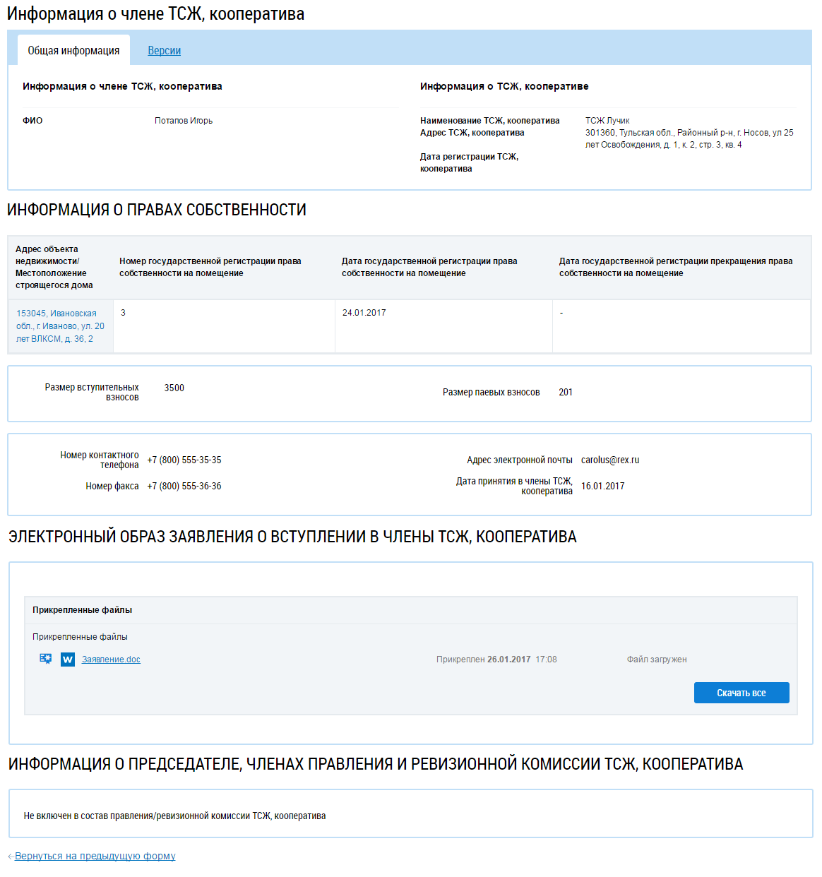Страница содержит общую информацию о ТСЖ (кооперативе), о председателе (в т.ч. его контактные данные), а также данные о том, когда и на какой срок он был избран на свой пост.