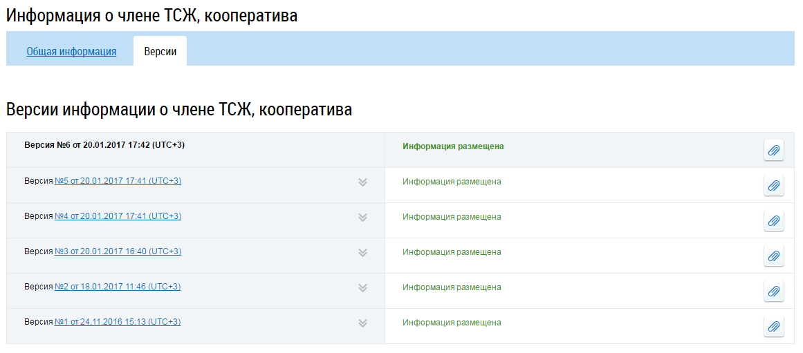 Вкладка «Версии» содержит историю изменений информации.