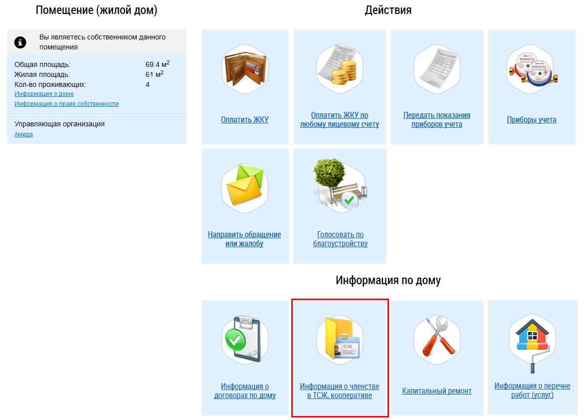 Для просмотра информации о членстве в товариществе собственников жилья или кооперативе нажмите на гиперссылку Информация о членстве в ТСЖ, кооперативе в блоке Информация по дому на главной странице личного кабинета. Этот пункт отображается, если способ управления вашим домом – ТСЖ, ЖК или Иной специализированный кооператив.