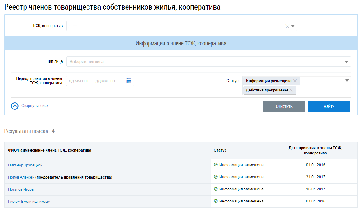 При наличии размещённой информации по ТСЖ или кооперативу в вашем доме отображается страница Реестр членов товарищества собственников жилья, кооператива, содержащая блок поиска и блок результатов поиска.