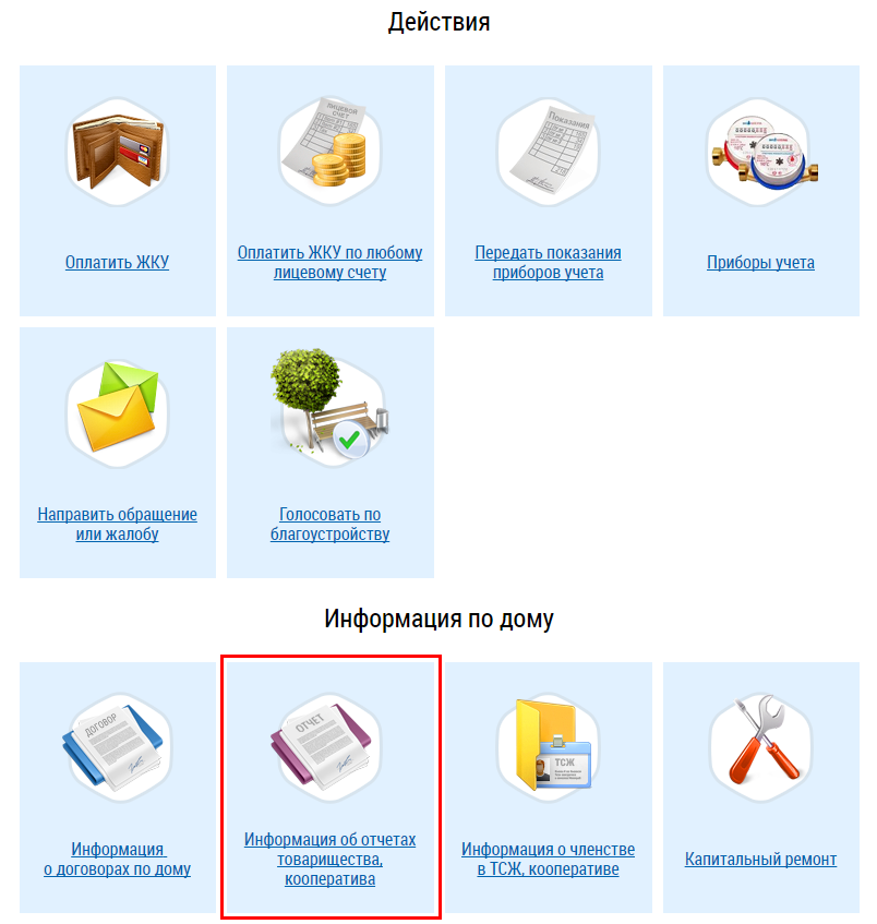 Для просмотра отчетов товарищества собственников жилья или кооператива нажмите на гиперссылку Информация об отчетах товарищества, кооператива в блоке Информация по дому на главной странице личного кабинета. Этот пункт отображается, если способ управления вашим домом – ТСЖ, ЖК или Иной специализированный кооператив.