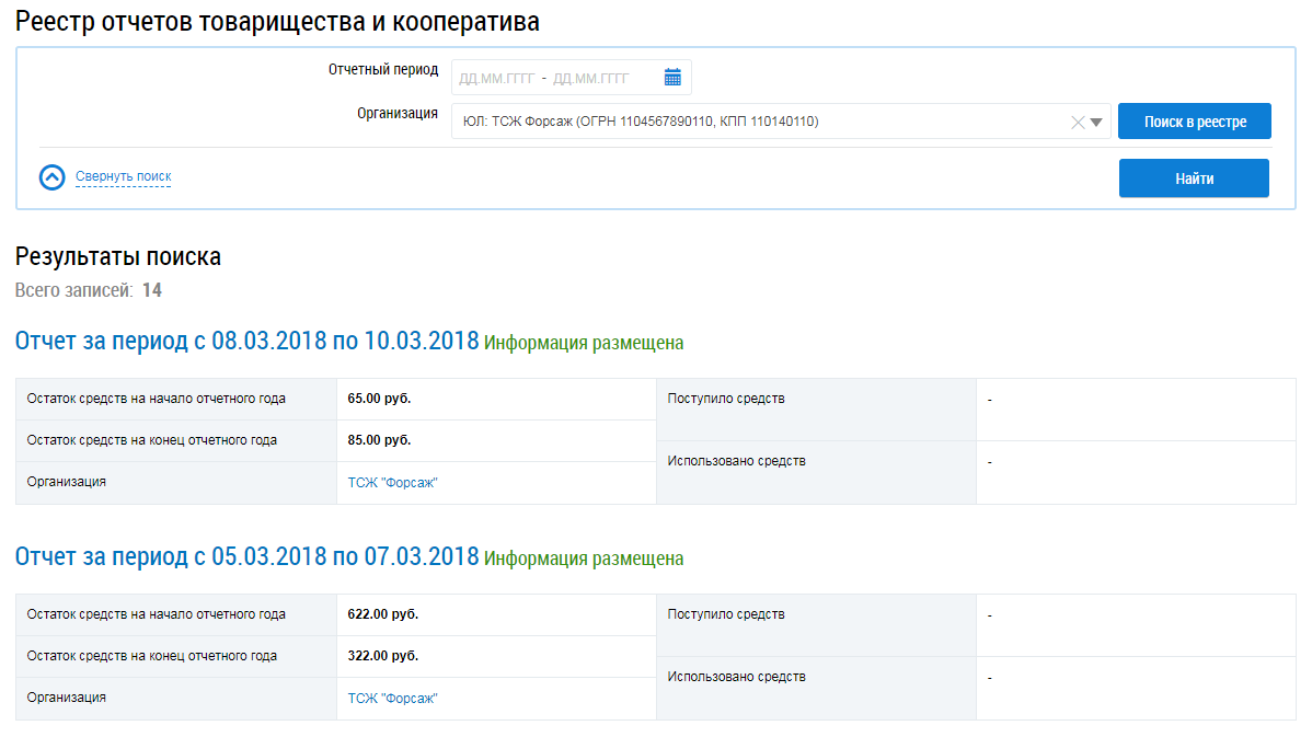 Отображается страница Реестр отчетов товарищества и кооператива, содержащая блок поиска и блок результатов поиска.