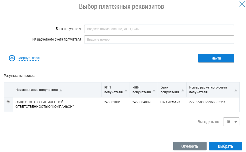 Введите параметры поискового запроса и нажмите Найти. Для выбора доступны платежные реквизиты организации исполнителя услуг, размещенные ею в системе. Выберите требуемый результат из списка и нажмите кнопку Выбрать. Снова отображается страница Выбор параметра платежа.