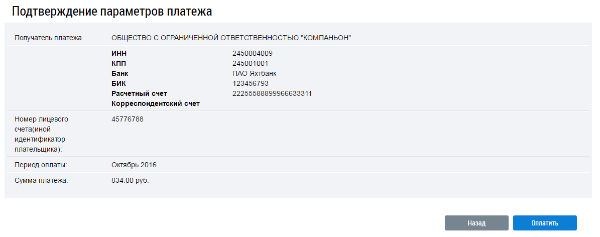 Далее в соответствующие поля введите номер лицевого счета или иной идентификатор плательщика, период оплаты и сумму платежа. Нажмите на кнопку Далее. Отображается страница Подтверждение параметров платежа.