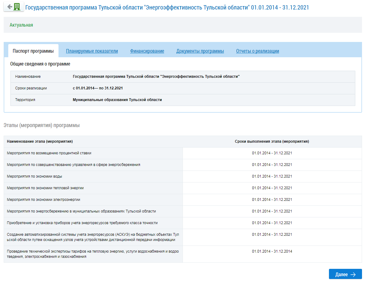 Вкладка Паспорт программы содержит общие сведения о программе, а также информацию об этапах (мероприятиях) программы.