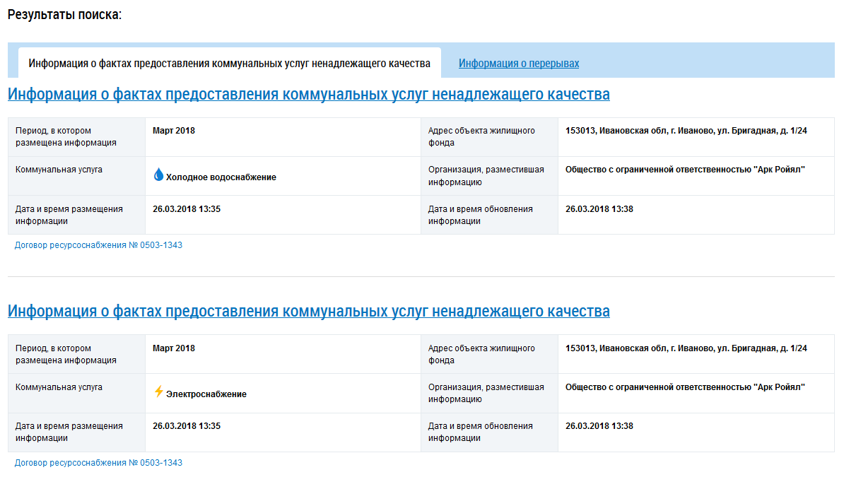 Ознакомьтесь с предоставленной информацией. Для просмотра договора ресурсоснабжения, приложенного к информации о факте предоставления услуги ненадлежащего качества, нажмите на гиперссылку с номером договора.