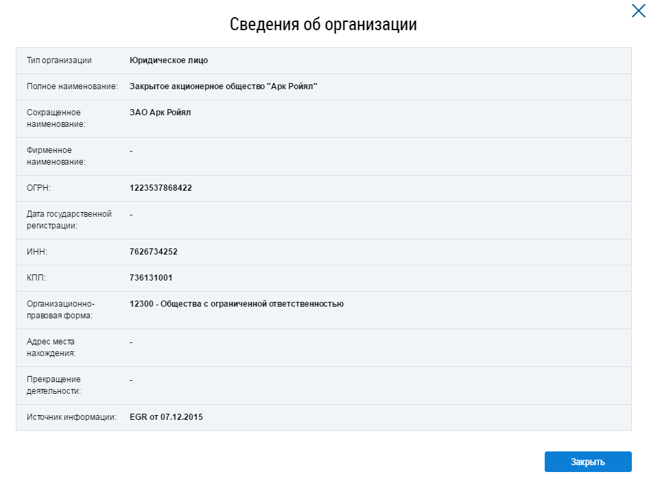 Для просмотра информации об организации, уполномоченной на предоставление платежных документов, нажмите на гиперссылку с наименованием организации. Отображается страница Сведения об организации (Страница «Сведения об организации»).