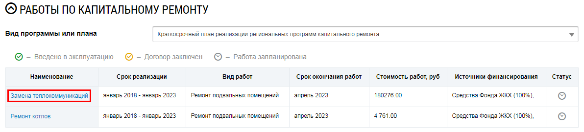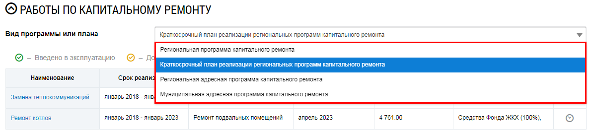 Для просмотра списка работ по капитальному ремонту выберите вид программы и плана из выпадающего списка. Отображается список работ, соответствующих выбранному виду. Если информация о включении дома в выбранный вид программы или плана по капитальному ремонту не размещена в Системе, в блоке отображается уведомление: «Отсутствуют программы/планы, содержащие адрес дома».