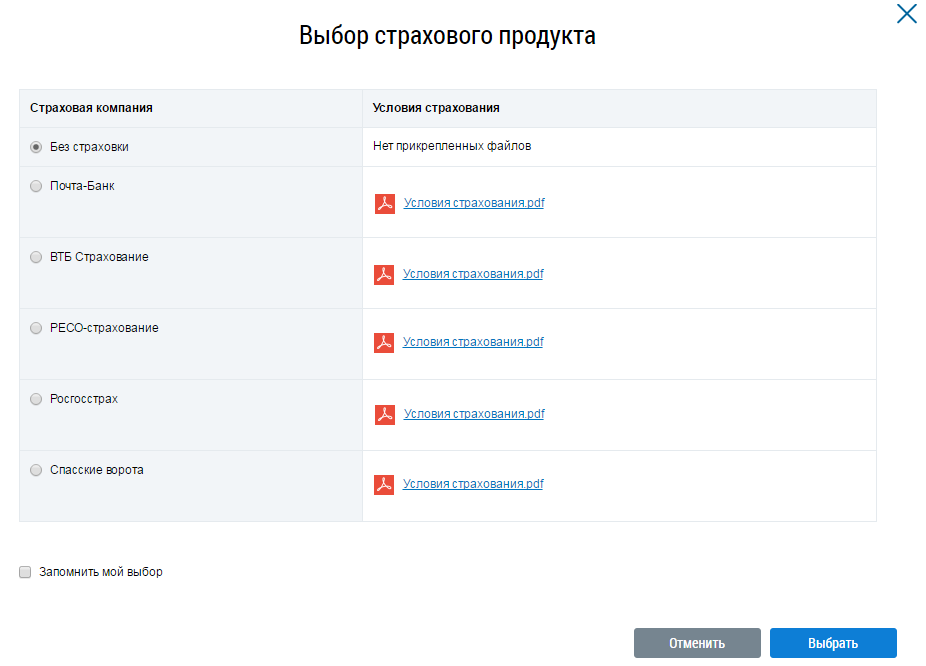 Ознакомьтесь с условиями страхования компаний, представленных в списке. Для этого скачайте файлы с информацией о страховании, нажав на гиперссылки с названиями файлов. Затем выберите одну из компаний, установив переключатель напротив названия соответствующей компании. Нажмите кнопку Выбрать.