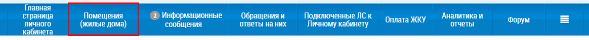 Для просмотра сведений о помещениях (жилых домах), по которым оплачиваются ЖКУ в личном кабинете, нажмите на пункт Помещения (жилые дома) горизонтального навигационного меню. Пункт меню отображается при наличии хотя бы одного подключенного лицевого счета либо при наличии сведений о праве собственности на помещение (жилой дом).