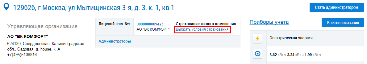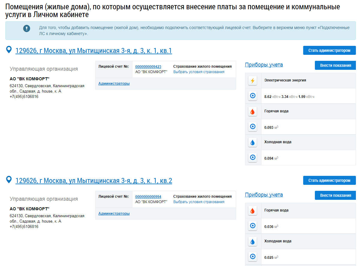 Просмотр сведений о помещениях, по которым оплачиваются ЖКУ в личном кабинете.