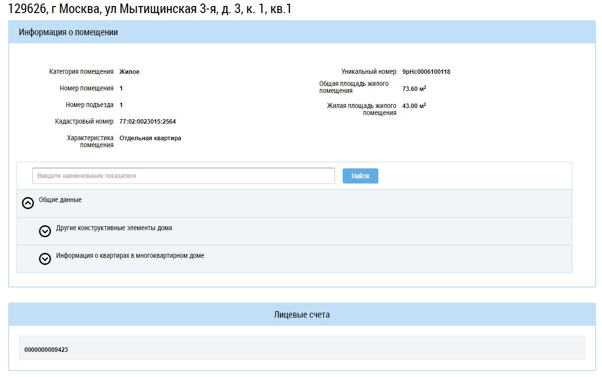 По каждой квартире (помещению/комнате) отображаются следующие сведения: