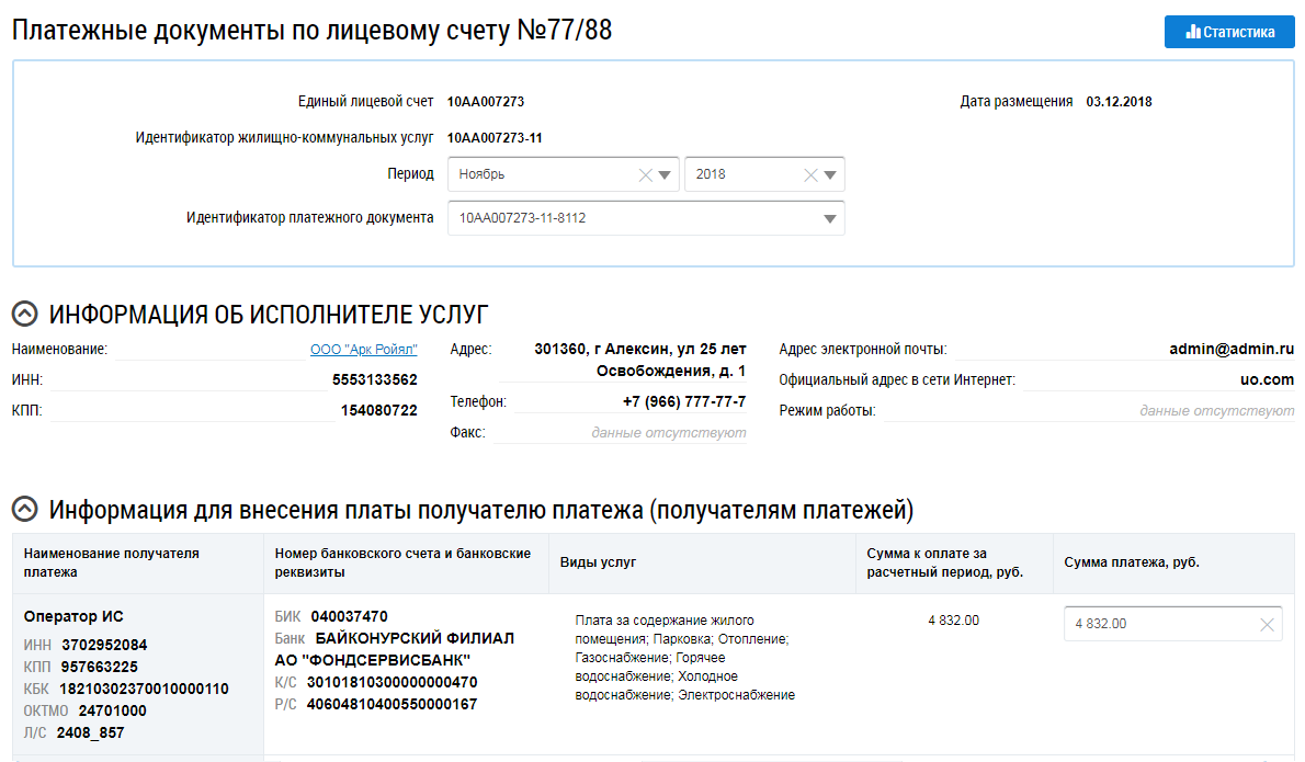 Отображается страница Платежные документы по лицевому счету, на которой указан единый лицевой счет, идентификатор жилищно-коммунальных услуг, идентификатор платежного документа.