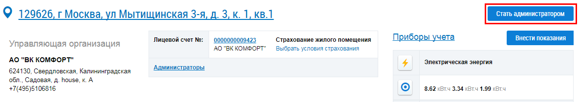 Для назначения себе функции «Администратор общего собрания собственников в многоквартирном доме» нажмите на кнопку Стать администратором напротив выбранного помещения.