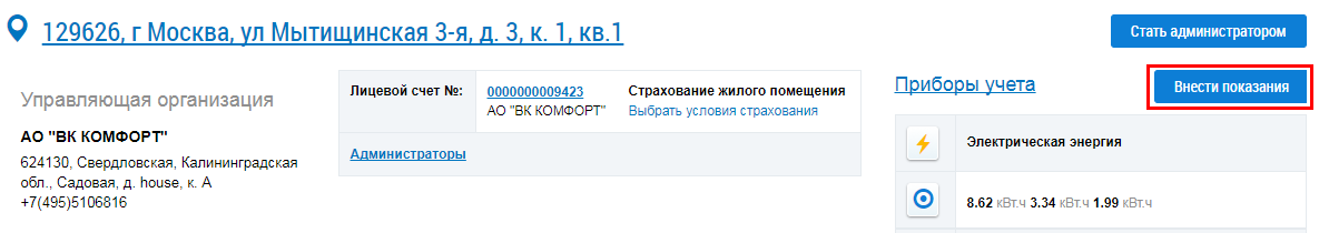 Для внесения показаний приборов учета по выбранному помещению нажмите на кнопку Внести показания.