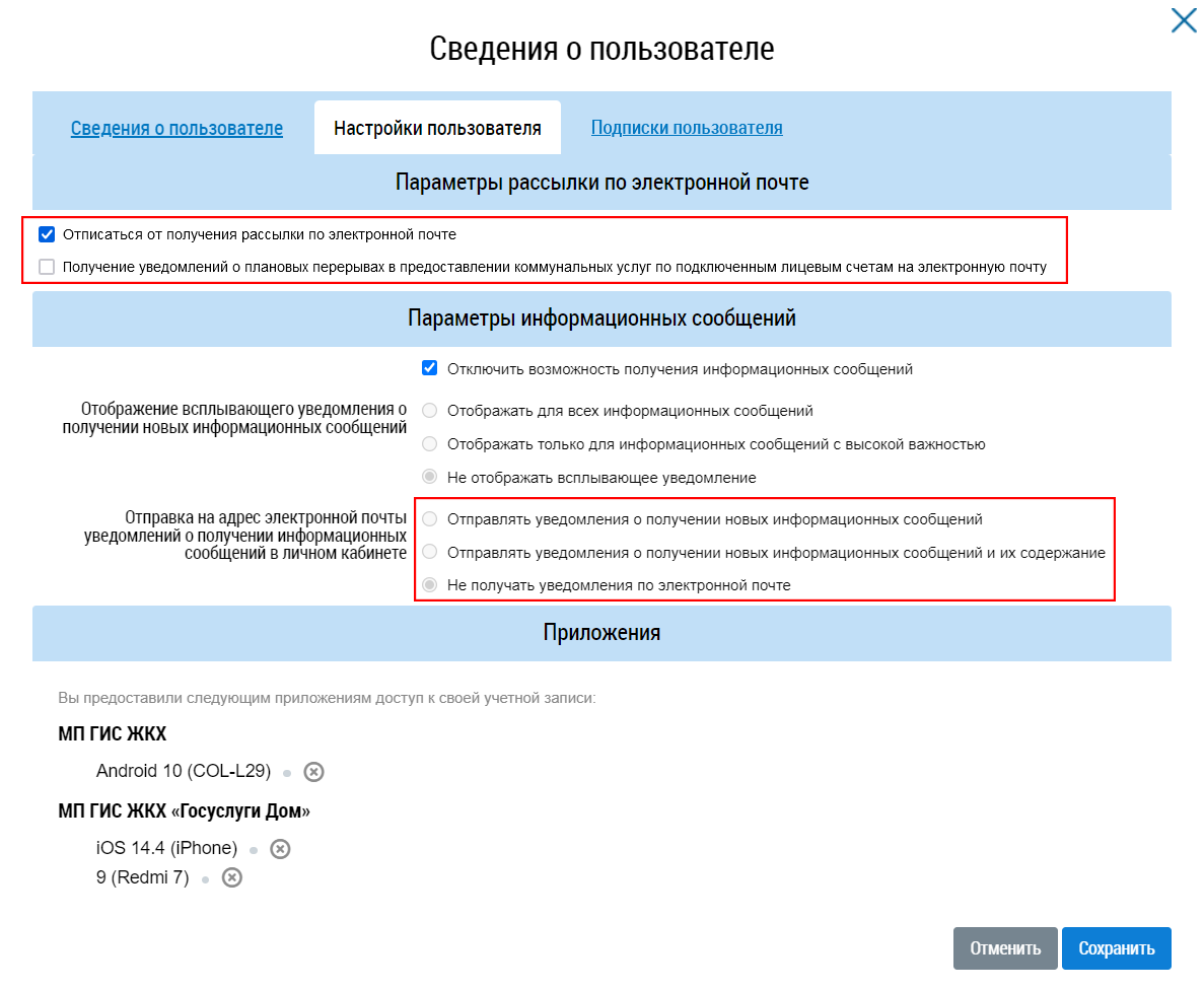 При установке флажка в поле Отписаться от получения рассылки по электронной почте выбор переключателя в поле Отправка на адрес электронной почты уведомлений о получении информационных сообщений в личном кабинете, а также поле Получение уведомлений о плановых перерывах в предоставлении коммунальных услуг по подключенным лицевым счетам на электронную почту становятся недоступными.