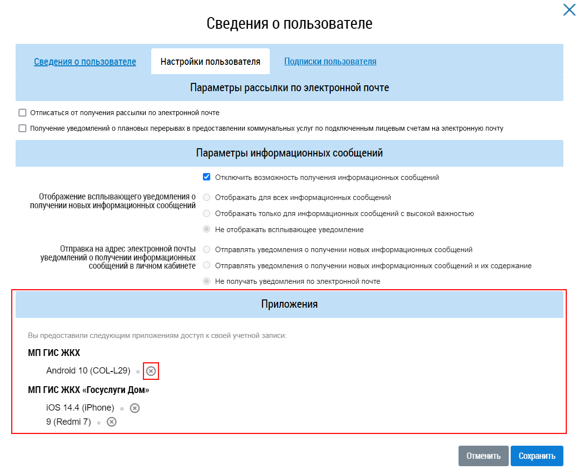 В блоке Приложения отображается информация о привязанных мобильных устройствах, которым предоставлен доступ к вашей учетной записи в приложениях МП ГИС ЖКХ и МП ГИС ЖКХ «Госуслуги Дом». В строке с названием мобильного устройства расположен цветовой индикатор. Зеленый цвет индикатора означает, что устройство находится в сети, серый - не в сети.